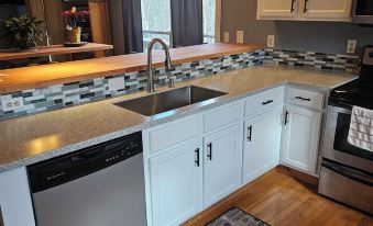 Our vacation home is three spacious and comfortable levels with plenty of room to accommodate multi-generational or multi-family vacations. The main level private master suite has a king bed, office workstation with desk. private bathroom and doors opening to the shaded rear deck. Enjoy the view of the lake when you wake up! The loft boasts two twin beds plus a futon, the lower level has a double bed & pull out couch. The second private bedroom on the lower level has a queen bed and views of the wooded area surrounding the property. A mini-bar and fridge help you keep the lower level stocked with snacks and drinks! Two full bathrooms in addition to the master bath, one on the main level with a shower and one on the lower level with a bathtub/shower combo. The full-size washer and dryer on the main level are stocked with detergent for your use.