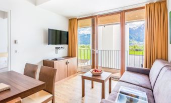 Piesendorf-Fürth: Modern, comfortable apartment block "Emma", 3 storeys. 2 houses in the residence. In a sunny, elevated position on a slope, 1 km from the lake, 2.5 km from the skiing area. In the house: sauna (extra). Storage room for skis, ski boot dryer. Bread roll service. In Winter: please take snow chains. Roofed, parking at the house. Supermarket 2.5 km, restaurant 280 m, bus stop "nach Kaprun und Zell am See" 500 m, outdoor swimming pool 3 km, thermal baths "Tauern Spa Kaprun" 1.7 km. Golf course (36 hole) 2.5 km, gondola lift 2.7 km, cross country ski track 1 km. Well-known ski regions can easily be reached: Maiskogel 2.7 km, Schmittenhöhe 8.9 km, Kitzsteinhorn 9 km. Well-known lakes can easily be reached: Zeller See 6.5 km. The holiday properties may differ in living space, floorplan, equipment and furnishing. The check-in for the Emma Apartments is in the Emma Deluxe apartment building (Fürth 153, 5721 Piesendorf). Late arrivals are only possible by prior arrangement (24 hours in advance). 2-room apartment 40 m2. Bright, tasteful and cosy furnishings: 1 double bedroom with satellite TV (flat screen). Living/sleeping room with 1 double sofabed, dining table and satellite TV (flat screen). Luggage room. Open kitchen (oven, dishwasher, 4 ceramic glass hob hotplates, toaster, kettle, microwave, electric coffee machine, Capsules for coffee machine (Nespresso) extra). Bath/bidet/WC. Underfloor heating. Large balcony. Balcony furniture. Very beautiful panoramic view of the mountains. Facilities: hair dryer. Internet (WiFi, free). Please note: non-smokers only. Maximum 1 pet/ dog allowed. Smoke alarm. The property is one of a type of property or apartment. 50616-001123-2020