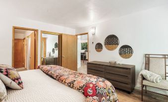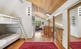 The upstairs/main area has a bedroom with King size bed, ensuite bathroom, kitchen, living and dining areas, and a large loft with two twin over full bunks, full bath, a lounge area, and two great decks. Downstairs living area has a bedroom with a king size bed, large bathroom, full kitchen, and living and dining areas. The downstairs is also equipped with a pack n' play and air mattress so kiddos can easily sleep nearer to guests in that bedroom.