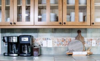o Primary Bedroom Office (attached to bedroom): Right off the master bedroom is a large office with a view of the creek and backyard deck. Equipped with a wet bar with a coffee pot and an espresso machine + steamer, a sofa bed that can sleep 2, and a desk and chair for working.