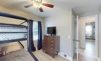 • Bedroom 2 (Main Floor): Twin-over-full bunk bed, smart TV, dresser, and closet