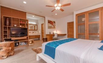 The open-concept interior boasts a large living room and gourmet kitchen with a large, crescent-shaped bar. The inspiring décor balances fine natural materials, a sea-infused palette, and a vibrant modern elegance illuminated by abundant natural light. Advanced smart home technology includes an alarm system, and the villa features air conditioning in every room.
