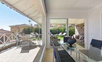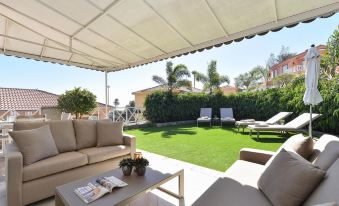 Modern, cosy single-family house "Chalet Santa Ana 19". In the centre of Playa del Inglés, in a central, busy position. For shared use: swimming pool angular (16 x 8 m, seasonal availability: 01.Jan. - 31.Dec.). Private: garden (fenced) with lawn. Garden furniture, barbecue, parking on the premises, public parking on the road. Shop, supermarket, restaurant 200 m, bus stop "Shopping Center Cita" 600 m. The owner does not accept any youth groups. Please note: airfield 32 km from the property. Neighbourhood highly sensitive to noise. Quietness and good behaviour expected. "Chalet Santa Ana 19", 4-room house 140 m2. Comfortable and modern furnishings: living/dining room with dining table, digital TV and air conditioning. Exit to the patio. 1 room with 2 beds and air conditioning. Exit to the patio. 1 room with 1 french bed. 1 room with 2 beds. Kitchen (oven, dishwasher, 3 ceramic glass hob hotplates, toaster, kettle, microwave, freezer, electric coffee machine). 2 showers/bidet/WC. Patio. Terrace furniture, barbecue, deck chairs. View of the sea and the forest. Facilities: washing machine, dryer, safe, iron, children's high chair, baby cot for up to 2 year olds, hair dryer. Internet (WiFi, free). Parking (1 car). Please note: non-smoking house. 2021-T9029 ESFCTU0000350130003079210000000000000VV-35-1-00165372
