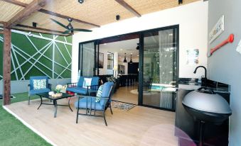 Step outside to the terrace with a BBQ area featuring an electric grill and enjoy your own private pool. The pool area includes lounge chairs, pool toys, and floaties—perfect for relaxing or family fun.