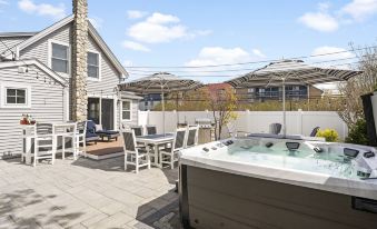 The backyard deck and patio are the best features of the house! There your private oasis will begin with two lounge chairs on the back deck. Full natural gas outside kitchen with a sink and grill. A stone gas fire pit surrounded by Adirondack chairs. A big outside shower with a waterfall shower head and handheld sprayer. Full 6 seat dining area, full outside bar, and a hot tub bar. The hot tub is a high luxury model that is big enough for 8 people. It features full messaging jets for each of the seats that are adjustable to each user. This house offers everything you could need for a small event or gathering right in Plymouth's historic waterfront!About pets:Pets allowed: dogs (limit 2 total).About checkOut:Check out before 10:00 AM.About children:Children allowed: ages 0-17.About checkIn:Check in after 4:00 PM.About smoking:Smoking is not permitted.About minBookingAge:Minimum age to rent: 21.About events:Events allowed: family gatherings and birthday parties.Maximum event attendees: 20.