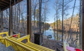 The main level bedroom has a queen bed and a private full bath while the bottom level has another Queen bed, full bath (connecting to hallway), living area with reclining couches and smart tv, laundry room and sliding doors going out to the patio area. The downstairs patio has 2 porch swings and propane fire pit for guests to enjoy. Or they can head down the stairs to the dock and enjoy the water!
