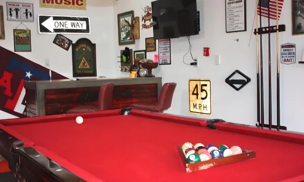 GAME ROOM: Full size garage with AC and fans, pool table, corn hole boards, washer boards, darts, chess, the ring game, and arcade games with unlimited, free game play