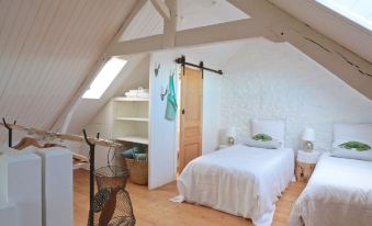 Duvet covers and pillowcases in washed linen, wardrobe and shelves, fan, skylights (Vélux) with sea view over the roofs of fishermen's houses, bathroom with sink and toilet
