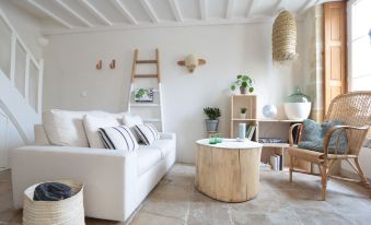 * Lounge area with sofa, armchair, bluetooth speaker, books, fireplace insert