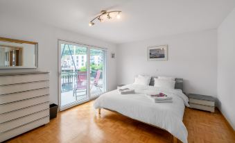 Large resort "Residenz Marina". On the outskirts, 300 m from the centre of Le Bouveret, in a quiet, sunny position, 200 m from the lake, 50 m from the canal. In the house: central heating system. Shop, grocery 800 m, restaurant, bakery 500 m, bicycle rental 190 m, bus stop "Bouveret village" 1.2 km, railway station "Le Bouveret" 300 m, pebble beach 200 m, outdoor swimming pool 300 m, indoor swimming pool 7.2 km, thermal baths 30 km, public bathing area 300 m, bathing lake "Léman" 300 m. Sports harbour 200 m, golf course (18 hole) 15 km, surf school 200 m, tennis, minigolf 12 km, walking paths from the house 300 m, mountain railway 15 km, slopes 18 km, ski school 18 km, children's ski school 35 km, sled run 29 km, cross country ski track 35 km, ice rink 18 km. Nearby attractions: Parc Aventure 17 km, Château Chillon / Fort de Chillon, Swiss Vapeur Parc 100 m, Aqua Parc 500 m. Well-known ski regions can easily be reached: Les Portes du Soleil 18 km, Villars 35 km, Leysin 31 km. Well-known lakes can easily be reached: Lac Léman. Hiking paths: Portes du Soleil. The keys‘ handover takes place by the agency Interhome in Bouveret. Neighbourhood highly sensitive to noise. Quietness and good behaviour expected. "Apt C4/R - Résidence Bougainville", 4-room apartment 150 m2 on 3 levels. Partly with sloping ceilings, tasteful furnishings: living/dining room with dining nook, separate WC, cable TV, CD-player, DVD and gas heating. Exit to the balcony. Open kitchen (oven, dishwasher, 4 ceramic glass hob hotplates, microwave, freezer, electric coffee machine, Capsules for coffee machine (Nespresso) extra). Upper floor: 1 large double bedroom with panoramic window with 1 double bed (180 cm, length 200 cm). Shower/WC. 2nd upper floor: 1 room with 2 beds (140 cm, length 200 cm), bath/shower/WC. Exit to the balcony. 1 room with 2 beds (90 cm, length 190 cm). Exit to the balcony. Terrace furniture. Very beautiful view of the mountains and the canal. Facilities: washing machine, dryer, iron, hair dryer. Internet (WiFi, free). Parking space n 116. Please note: non-smokers only. Smoke alarm.