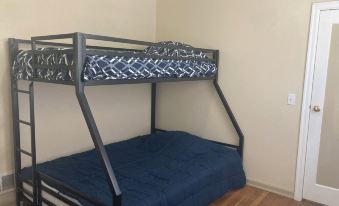 The primary bedroom has a king size bed and a closet with storage space. The secondary bedroom has a bunk bed with a twin mattress above and full mattress below, as well as a desk for remote working. The home is equipped with high speed internet for all of your teleworking needs.