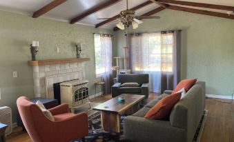 The dining room seats six people. The kitchen has expansive counter space for cooking and is equipped with a dishwasher, full-size fridge and freezer, microwave, stove, oven, and charming breakfast nook. Cooking utensils, coffee maker, and dishes are all provided.