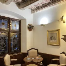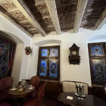 호텔 내부는 동유럽의 특징을 갖고 있으며 아름다운 천장과 아래층의 풍경을 볼 수 있는 창문이 있습니다.