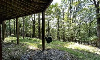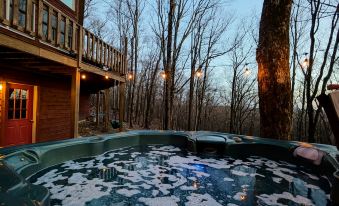 Step outside the basement living area to find the hot tub nestled in the woods—perfect for a quiet, relaxing getaway.