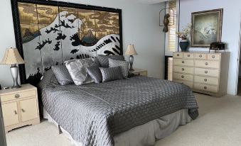 Inside, the living room is a work of art with a stunning full wall of etched glass depicting the mesmerizing crashing waves, which come alive at night to set the perfect ambiance. Designer furniture and artwork adorn every corner, showcasing the impeccable attention to detail and custom-made touches that make this unit one-of-a-kind.