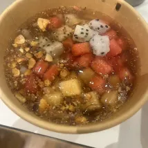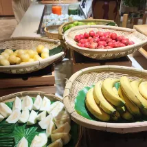 제가 들어가자마자 풍부하고 다양한 음식에 매료되었습니다. 과일 구역만 해도 색깔이 예쁜 바나나, 얇게 썬 멜론, 이름을 알 수 없는 빨간색과 노란색 과일로 가득 차 있습니다. 마치 과수원을 바로 이곳으로 옮겨온 것처럼 신선하고 통통합니다! 🍌🍈