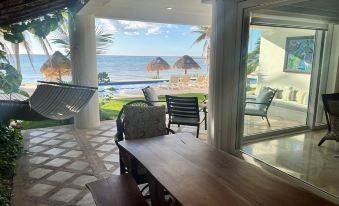 The dining room, adorned with custom furnishings, sets the stage for memorable gatherings around a table for eight. Immerse yourself in the breathtaking ocean views seamlessly integrated into our living space through large glass patio doors. Step outside on the beachfront patio and have the Riviera Maya become your living room. With comfortable seating, hammock, and separate dining table for eight, there's no better place to enjoy our seaside retreat. Step back inside and our LED smart TV, equipped with a Firestick and Netflix, ensures entertainment, while high speed Wi-Fi internet keeps you connected.