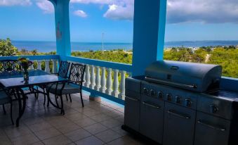 The private back deck off the living space boasts breathtaking views of the ocean and mountains of Rincon. It is equipped with deck chairs, dining table, and BBQ. Also a great space for activities such as massages and yoga!