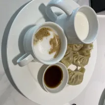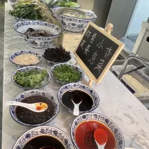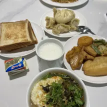 출장으로 치동에 왔는데, 새로 오픈한 호텔이라 방이 아주 넓은 것 같아요. 아침 식사에는 만두, 만두, 완탕이 포함되어 있어요.
