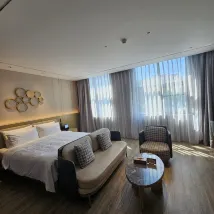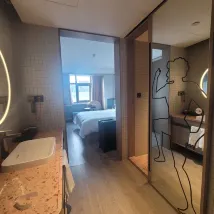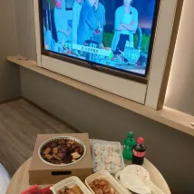 방은 매우 깨끗했고, 객실 전체가 스마트 시스템으로 되어있어 편리했습니다. 와이파이도 잘 터지고 TV 미러링도 가능해서 유용했어요. 배달 음식을 시키면 로봇이 객실 문 앞까지 가져다주는 것도 인상적이었습니다.