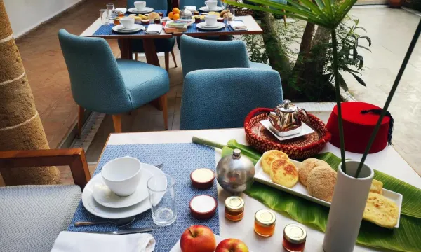 We stayed in Riad Kalaa on our first night in Morocco and it was brilliant. Our room was beautiful, every detail was perfect. Lovely bedding and huge fluffy towels. They arranged a taxi from the airport for us and he walked us to the Riad which was great. The staff were friendly and helpful and gave us advice on where to walk to get the best out of the medina. Breakfast was lovely, fruit, yoghurt, cheese, bread, cake and eggs cooked to order.