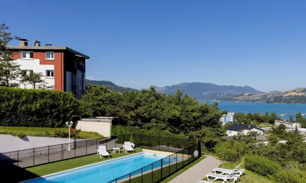 Good location with a lovely view from restaurant and rooms with nice sitting places in the grounds, as well as a (small) swimming pool overlooking the lake. Easy parking and near enough to walk around the village. The rooms are quite old fashioned, ours didn’t seem to have any hot water in the hand basin and it didn’t seem to have been updated for years. However it was clean quiet and comfortable in the old French style of a good restaurant with less good rooms. We had a very good fondue and charcuterie in the restaurant.