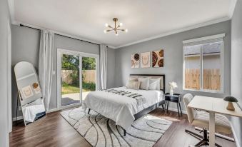 This stylish retreat offers three bedrooms, including one with a dedicated work station featuring a standing desk—ideal for remote work or browsing with high-speed fiber internet. The home comes with two full baths, a fully equipped kitchen stocked with essentials, a private backyard for relaxation, and a Tesla EV charger for added convenience. Whether for work or leisure, this home ensures a comfortable stay.