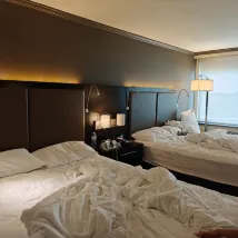 객실의 인테리어와 구조는 훌륭했고, 가구들은 영리하고 논리적으로 배치되어 있었습니다. 큰 캐리어 네 개와 작은 캐리어 네 개를 넉넉하게 수납할 수 있었고, 공간도 많이 차지하지 않았습니다. 1.5m 더블 침대 두 개는 성인 두 명과 아이 두 명에게 충분했습니다. 작은 책상, 업무용 책상, 아주 큰 TV 스탠드, 그리고 욕실 세면대도 있었습니다.