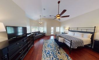 For Groups that want need additional private rooms we can offer our Guest Home located over our 4 garage workshop/garage. The Guest Home close to 1500 sqft and sleeps a 4 additional people Max. The Guest Home is an additional charge if adding to the Main House Stay. It is accessed thru the workshop and upstairs. It is very well appointed with fully equipped kitchen with freezer, fridge, cooktop/oven, and microwave. There is seating at the granite counter top for 2, table for 2 and then a living room area with a love seat & 2 chairs & TV. There is 2 bedrooms. The 1st bedroom has a twin size bed and we also have an additional twin size bed that is a roll out folding bed. This room also has a small office nook. You do pass thru bedroom #1 to enter into Bedroom #2 which is the Master Suite. The Master Suite of the Guest House does have a Cal King Bed with TV. The Guest can sleep 2 people comfortably. All the furnishings, beds, linens, and accessories are brand new! If you are renting the Main House and include the Guest House with your stay then the Guest House does have full pool privileges. If choose to only rent the Main House then only the Main House has the pool/spa privileges. FOR ADDITIONAL ACCOMMODATIONS, PLEASE REFER TO VRBO# 740547 FOR PICTURES & MORE INFORMATION ON THE GUEST HOME AMENITIES. THE GUEST HOUSE MAY BE RENTED OUT CONCURRENTLY - SUBJECT TO AVAILABILITY. Please inquire for pricing to add the Guest Home into your stay. Prices quote here are only for the main estate.