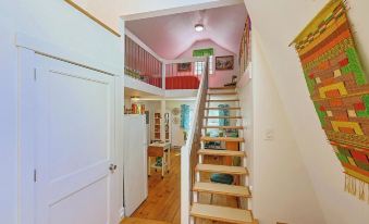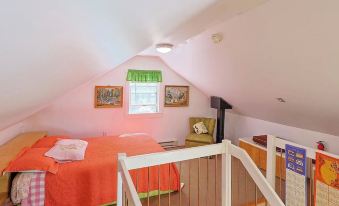Kitchen is well-equipped for cooking and baking. Cozy space with two sleeping lofts, living room, kitchen and bathroom (with small shower, no tub). Queen bed in one loft; single in the other. Livingroom has double-size convertible couch. Single daybed as well. Bed linens and towels are provided.