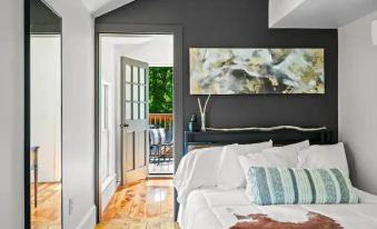 The second bedroom features a king sized bed and en-suite bathroom. This bathroom has a large Kohler soaker tub and the tile reveals a unique original inscription carefully preserved. All of this comfort and style just steps away from all that quaint downtown Rockport has to offer!