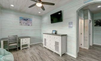 with desk, chair, and TV. This space can be used as an office or kiddos game room. The