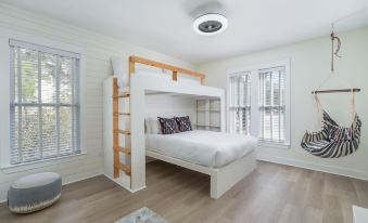 this home has a king bed located in the master bedroom along with an ensuite bathroom, a twin-over-twin bunk bed and twin-over-queen bunkbed in the first guest bedroom, and a queen bed in the second guest bedroom along with an additional full bathroom off the kitchen.
