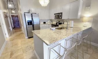 A spacious king master suite with a king bed, custom double vanity, a large walk-in shower, and a jetted tub, providing the ultimate relaxation experience. The second bedroom is perfect for families with two queen beds, accommodating up to four guests. Kids will love the third bedroom, featuring two custom-built twin bunk beds, creating a fun and cozy space for them to unwind. The living room offers additional sleeping space with a queen sleeper sofa. Finally, a fully equipped kitchen: cook up your favorite meals in the spacious kitchen featuring granite countertops, stainless steel appliances, and a stylish tile backsplash.