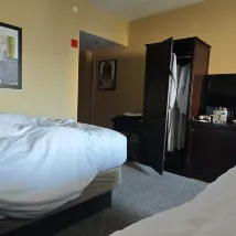 출발 1주일 전에 공항셔틀버스 어디서 타야하는지 메일로 보냈는데 다시 전화해서 물어보니 아무도 답이 없더라구요. . 공항에 도착했는데 못찾아서 다시 전화해서 찾았어요. 조금 기다리니 차가 왔습니다. 호텔 객실은 꽤 넓고 매우 조용하며 난방 시설도 꽤 좋습니다. 시차로 인한 피로로부터 잘 쉬었습니다. 욕실에는 샴푸, 컨디셔너, 샤워 젤이 있으며 세면도구를 요청하려면 전화해야 합니다. 슬리퍼는 없습니다. 호텔 근처에 대형 패션 아울렛이 있습니다. 택시를 타려면 약 5달러가 소요됩니다. 아침 식사는 기본적인 미국식 아침 식사입니다. 호텔 셔틀버스가 30분 간격으로 운행되어 매우 편리합니다. 공항셔틀버스 타는 방법이 명확하지 않은 점 빼고는 전체적으로 느낌이 꽤 좋았습니다.