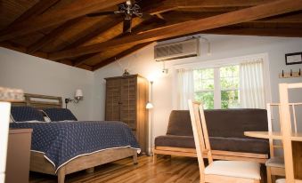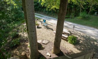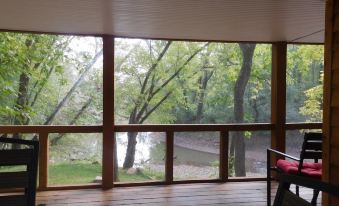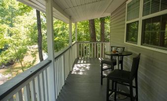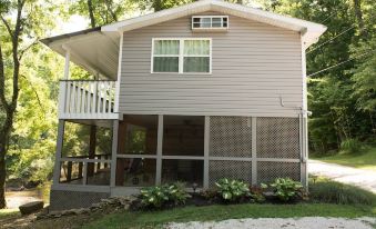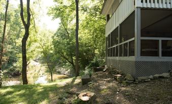 The Cabin is known for its setting on the bend of Triplett Creek. The view is always relaxing and especially enjoyed from the screened-in porch on the ground floor. The studio living area on the second floor features a queen bed, full futon sofa bed, kitchen, table and chairs, separate bathroom with shower/tub unit and washer/dryer. There is an outdoor picnic table with fire pit and seating.