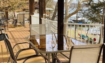 This is a 4 Bedroom, 3 1/2 Bath home on MM1 of the Little Niangua. Walking into the main level is an entry with hardwood floors. You will immediately see beautiful, tall, arched windows looking out onto the lake from the family room. A large gas fireplace with a 70” TV on top situated between these windows allows for sitting in front of the lake view windows, watching TV at the same time. There is a couch and two recliners all surrounding and facing the windows/tv. Well stocked kitchen for preparing meals with plenty of cabinet storage and granite countertop space. The kitchen faces the lake, so you can enjoy views while preparing to feed your group. There is a breakfast bar, which separates the kitchen and breakfast nook. The bar seats four and the breakfast nook seats six. Windows facing the lake surround the breakfast nook, so you can start enjoying the view of the lake first thing in the morning. There is an additional dining room with a large table seating eight. Great space for playing games together as well. The laundry is a separate area behind the kitchen separated by a door with a large table for extra storage of your “stuff” or folding laundry. There is a half bath for general use on the main level as well. The master suite is on the main level with a king sized bed and a wall of windows with a door to access the deck on the lake side. A 55” tv, chest of drawers, dresser and two night stands for your use. Walk to your master bath and there are two double closets, his and hers, with full length mirror doors! The HUGE master bath is equipped with a walk-in shower, double sink, toilet and jetted garden tub! Take an easy walk down the steps with a handrail to the lower level to find another family room with bar/kitchenette. The bar is stocked with bar glasses, mini fridge, microwave and single cup coffee maker for your convenience. The bar has stools for four people. The family room is furnished with a loveseat and two recliners, checkerboard table and two chairs, electric fireplace and 43” TV. There are three bedrooms and two baths on the lower level. Each bedroom has a ceiling fan. Bedroom one is set up to sleep four with a queen bed and two twin beds, dresser, two night stands and a 32” TV. Bedroom two is set up to sleep four with a queen sized bed, a trundle daybed, a dresser and a 43” TV. Bedroom three is set up to sleep five with a queen sized bed and a single over double bunk with a 43” TV. There is a bathroom with a single sink, toilet and walk-in shower that is accessible from bedroom three and also from the main living area. There is a large bathroom with tub/shower, single sink vanity, toilet and built-in makeup vanity, which is accessible from bedroom two and also the main living area. The covered deck on the lower level runs the full length of the house. You can access the deck from bedroom two and from the family room through sliders. Plenty of deck furniture for sitting outside. The way the house is designed allows for each level to have privacy and separation needed at times when traveling in a big group. Very gentle walk from the lower level to the dock. Parking for 5-6 vehicles and a grassy area across the road in alignment with the house for extra parking of vehicles or trailers.