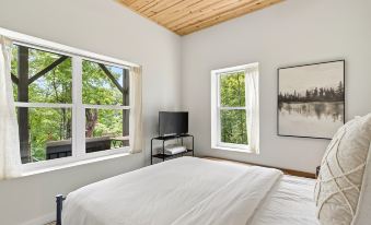 An open kitchen, inviting dining room, and cozy living room with TV. Floor-to-ceiling windows ensure the space is bathed in natural light, offering stunning lake views. Step out onto the la petite balcony for fresh air.