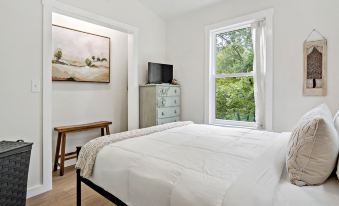 Main Level Master Bedroom: Drift off to sleep in the queen-sized bed, catch up on your favorite shows on the TV, and enjoy the convenience of an en-suite full bathroom with a shower.