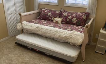 Master bedroom has a king bed, second bedroom has a queen bed and third bedroom has 2 twin beds. Two blow up mattresses are available for extra sleeping capacity. Each bedroom has a TV for streaming. The house has two full bathrooms, washer/dryer and wireless internet.