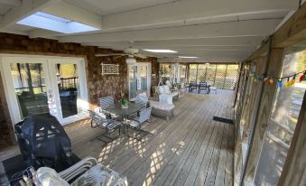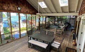 The expansive porch runs the width of the home and has 2 tables with total seating for 10, a 2-seater porch swing, recliner, 3 ceiling fans and gas grill. Gather around the tables to share a meal with family or friends or relish in the scenic solitude by simply listening to the lapping of the water. Two of the bedrooms have private entries to the porch, along with direct views of the water.