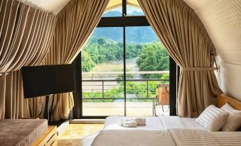 De locatie, gastvrijheid en accommodatie waren uitmuntend. Wij hadden met een gezin van 2 volwassenen en 2 kids en hadden 2 tenten met rivierzicht naast elkaar. Het uitzicht op de rivier was geweldig mooi. Ook het zwembad is heel mooi en fijn. Bij het resort is een restaurant voor ontbijt en diner. Vanuit het restaurant ook een heel mooi uitzicht over de rivier. Het eten is lekker met zowel keuze uit Thais als westers eten. Het allerbeste is de service van de lieve mensen van het resort!! Wij hadden zelf een auto en dat is wel een must. In de nabije omgeving alleen locale restaurants en 7-11 op 10 minuten rijden.