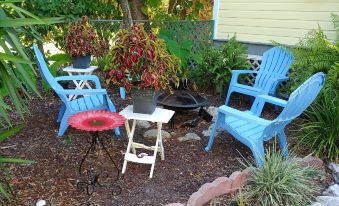 Indoor dining area, updated kitchen with Granite and Stainless Steel Appliances, an outdoor Patio set on the Screened in Porch where guests can enjoy a café and scones in the AM or cocktails & Tapas in the evening. In the garden area we boast a picnic table, Bar-B-Que, and a fire pit/sitting area.