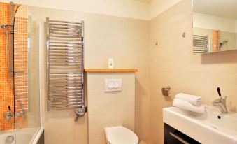 Practical and comfortable apartment. Good bedding and convenient access to parking and ski storage. A bit far from the lifts. Small shopping center nearby.