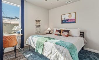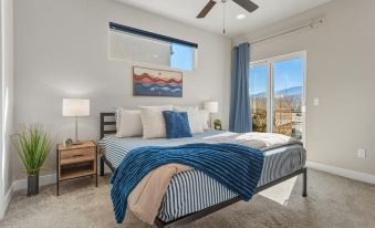 Unwind in our stylish, open-concept living area, featuring comfortable seating, high-speed Wi-Fi for planning your next outing or streaming, and large windows that offer views of the surrounding mountains. The fully equipped kitchen features modern appliances, including a coffee maker, microwave, and fridge—ideal for packing picnic lunches for a day on the river. Rest up in the queen-sized bed with plush, river-inspired bedding after a day on the water, and refresh in the sleek bathroom with a walk-in shower and complimentary toiletries. Subtle rafting decor, like paddle accents and Arkansas River maps, adds to the adventurous vibe.