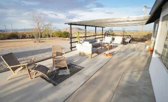 Our spacious 5 bedroom ranch is situated on 5 acres of sprawling Mojave landscape and beautiful Joshua Trees. Release your inner calm with our yoga master mind studio. We have thought of everything you need for your desert hideaway experience. Once here, effortlessly enjoy mountain tops and nightly star shows or simply sit back & enjoy the living room, firepit, take a hot tub or ease into a yoga pose with your tribe. Outfitted with 3 private bathrooms, optional 5th room, pool & outdoor shower