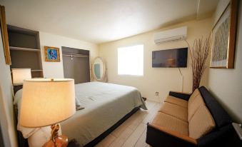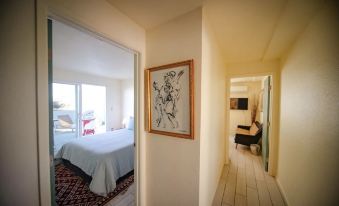 The home features 2 bedrooms, each with a king-sized bed, 1 bathroom, and a fully equipped back patio with a hot tub, grill, and sun-lounging chairs. The walls display original artwork from local artist Keely King.
