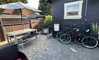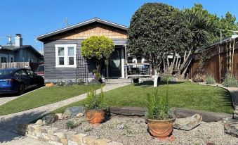 Imagine waking up to the gentle rustle of chimes outside your window, knowing that the beach's salty breeze is just a few miles away, beckoning you to a day of sun-soaked bliss. Our charming black home, adorned with wood accents and crisp white trim, stands as a beacon of hospitality in the bustling cityscape.