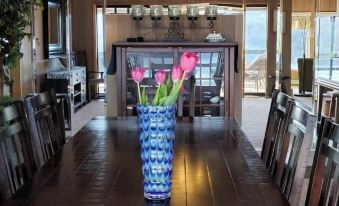 The main level is entirely accessible, with no stair steps at all, so your vacation can be enjoyed by all. The spacious dining room has extendable table that can seat up to ten. A large gas fireplace in the living room brings you all the enjoyment of a cozy fire. Several comfortable recliners in the living room are perfect for putting your feet up and simply enjoying the changing views and the beauty of Eastsound and Cascade Bay.