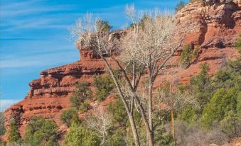 The interior is bathed in natural light, thanks to cathedral ceilings and floor-to-ceiling windows that frame breathtaking views of the red rock cliff face along the river. Step outside onto the expansive deck, where the tranquil sound of the river serenades you as you fish, take a leisurely walk, or simply lie back and stargaze. This area, designated as an official Dark Sky Area, promises an unobstructed view of the Milky Way and many constellations.